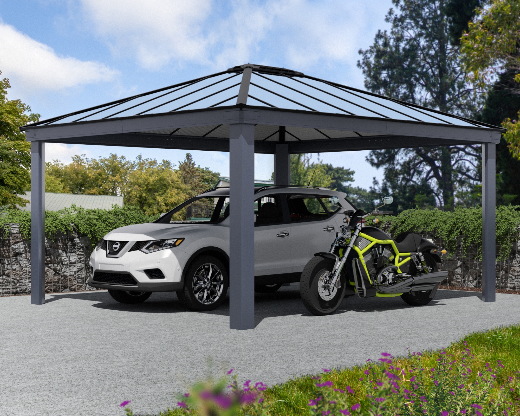 Canopia | Colorado 4.3 m Carport auto Serie Structură gri / Panouri opace gri cu pereți dubli Parcați mașinile în stil în aleea dvs. cu Carport-ul auto extra-larg Colorado. Acest kit de Carport auto din aluminiu vă oferă un loc de parcare acoperit pentru a vă proteja vehiculele de intemperii și are doar 4 stâlpi și o intrare largă pentru a găzdui confortabil două mașini mari. Vehiculele sunt scumpe și este important să preveniți reparațiile costisitoare și să vă protejați investiția de ploaie, zăpadă și razele UV. Panourile de acoperiș din policarbonat gri mat au rezistență la intemperii pe tot parcursul anului și oferă umbră completă pentru a menține mașina rece, a păstra vopseaua și a vă oferi liniștea că mașina va fi protejată de intemperii. Contrastul vizual dintre cadrul robust din aluminiu și acoperișul cu două ape transformă spațiul dvs. din simplu în contemporan. Cu profiluri pre-găurite și panouri pre-tăiate, acest mare kit DIY de Carport auto este gata de asamblare și ușor de instalat. Adăugați atracție bordurii și protejați-vă vehiculul pentru anii care vin cu Carport-ul auto metalic Colorado.