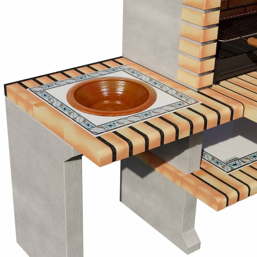 Suportul inferior din beton și cărămidă este completat de plăci tradiționale, iar vasul din lut integrat, oferă funcționalitate suplimentară.