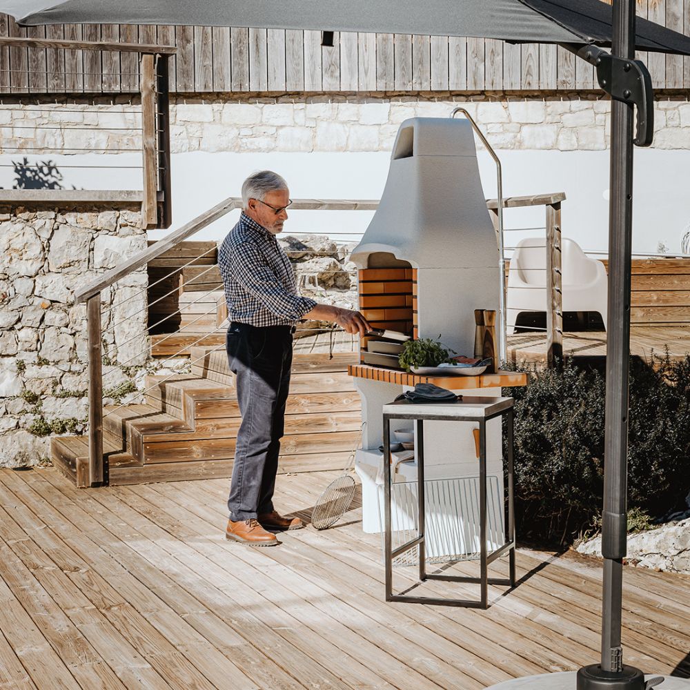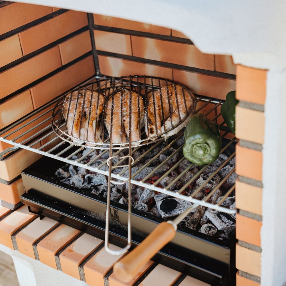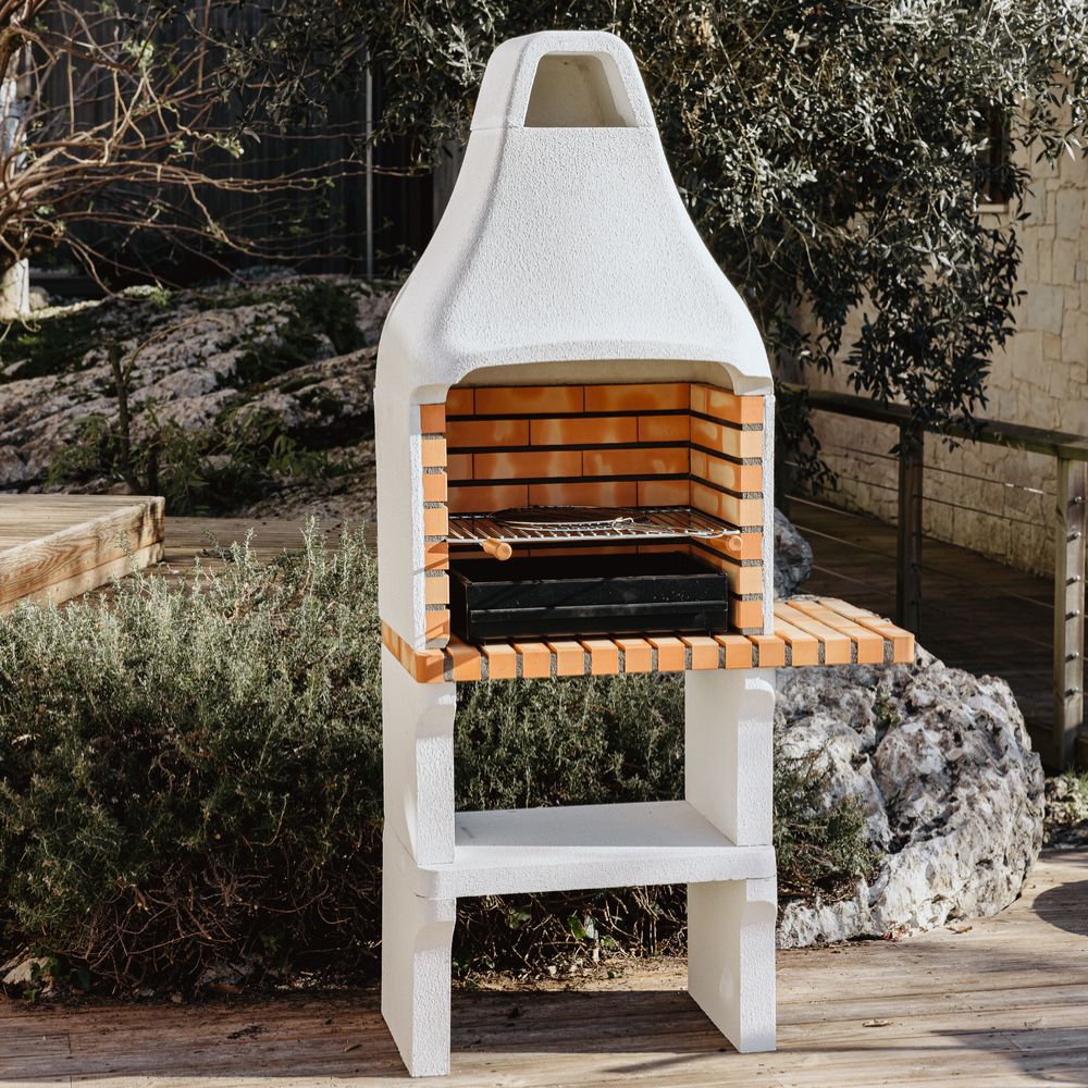 Grătar din beton refractar gri și cărămidă portocalie deschisă, cu grătar zincat de 56 x 35 cm, suport metalic cu sertar pentru cenușă și un suport lateral mini. Ideal pentru până la 5 persoane.