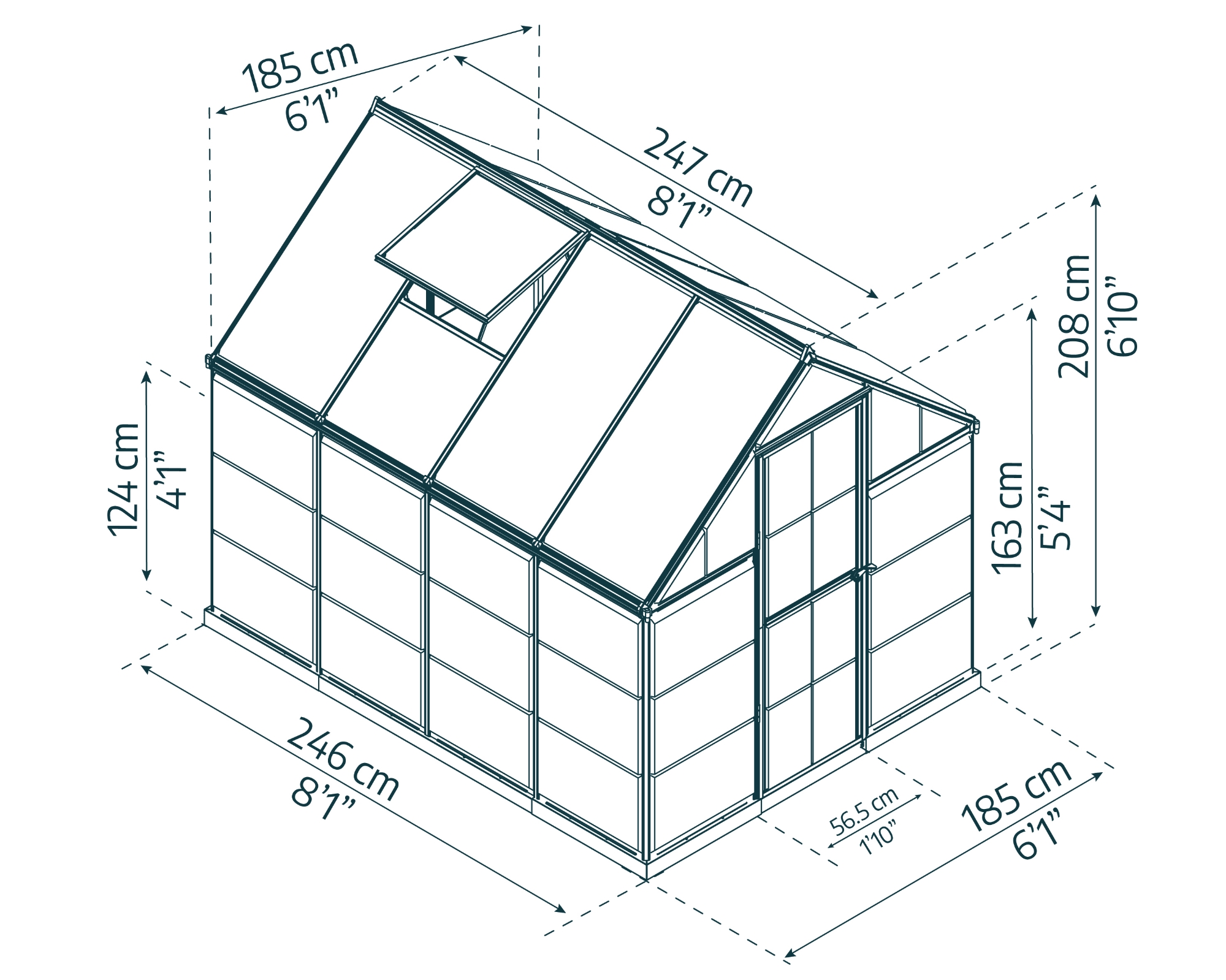 Când vă spunem că Kit-urile pentru Serele Hibrid Canopia oferă plantelor dumneavoastră condițiile optime pentru îngrijire și creștere, ne referim la asta. Hibridul este o seră ingenioasă care oferă entuziastului de grădinărit un echilibru precis între două tipuri de geamuri, obținând o seră DIY echilibrată care combină protecția panourilor de acoperiș cu pereți dubli difuzați cu transmiterea luminii panourilor de perete cristal clar pentru condiții ideale de creștere. Toate panourile sunt fabricate din policarbonat protejat UV, practic indestructibil. Această seră de dimensiuni versatile include o bază perimetrală, din oțel galvanizat rezistent la rugină, adăugând suport structural, stabilitate și aliniere. Fereastra de ventilație a serii ajută la menținerea temperaturii și nivelurilor de umiditate dorite și oferă ventilație. Fabricată din materiale 100% reciclabile, combinația dintre panourile de policarbonat sigure cu cadrul de aluminiu rezistent la rugină vă oferă o seră bine proiectată și durabilă, astfel încât să nu vă faceți niciodată griji cu privire la robustețea sau siguranța. Puternică și atractivă, proiectată să se potrivească în spații mai mici, această Sera Hibrid vă oferă ani de plăcere de grădinărit fără întreținere. Panouri de Acoperiș Difuze: Panourile de acoperiș cu pereți dubli de 4 mm protejează de expunerea puternică la lumina solară (82% transmisie de lumină) și protejează plantele de înghețurile de toamnă. Panouri de Perete Clare: Panourile laterale cristal clar asigură peste 90% transmisie de lumină, dar blochează razele UV nocive. Policarbonat: Panourile rezistente sunt 100% protejate UV, practic indestructibile și nu devin galbene sau fragile în timp. Structură Durabilă: Cadrul din aluminiu cu finisaj natural și acoperit cu pulbere, ambele fiind metale puternice și rezistente la rugină. Opțiuni de Culoare pentru Structura din Aluminiu: Argintiu - finisaj natural, Gri - RAL 7012, Verde - RAL 6005 și Negru - RAL 9005. Asamblare DIY: Sistemul de panouri glisante include profiluri pre-împănate, panouri glisante pre-tăiate pentru o instalare ușoară. Bază din Oțel Galvanizat: Baza din oțel galvanizat inclusă cu găuri desemnate pentru ancorare (ancorele nu sunt furnizate) pentru stabilitate structurală suplimentară. Caracteristici Ale Ușii: Ușă cu balamale din aluminiu, cu închidere magnetică prietenoasă pentru a menține sera deschisă. Poate fi asamblată pe ambele părți. Ventilație: Ferestre de ventilație manuale ale acoperișului permit ajustarea umidității, temperaturii și ventilației pentru a vă menține răcooliți în zilele fierbinți. Modelele 2x3.7m & 2x4.3m includ două ferestre de ventilație pe acoperiș. Jgheab: Include sistem de jgheaburi integrat pentru a direcționa și colecta cu ușurință apa de ploaie. Rezistență Meteorologică Pe Tot Parcursul Anului: Rezistentă la vânt, zăpadă și grindină. Testată pentru a rezista la vânturi de până la 90 km/h și 75 kg/m² de zăpadă. Accesorii Certificate Disponibile: Încălzitor cu ventilator, kituri de iluminat, kit de pânză de umbrire, deschizător automat pentru ventilația acoperișului, etajere și rafturi, cârlige pentru plante, kit de cățărător pentru plante și kit de irigare prin picurare sunt toate disponibile pentru achiziționare separată. Garanție: Garanție Limitată pe 5 Ani. Vă rugăm să asigurați instalarea pe o suprafață plată și nivelată pentru construcție cu bază solidă.