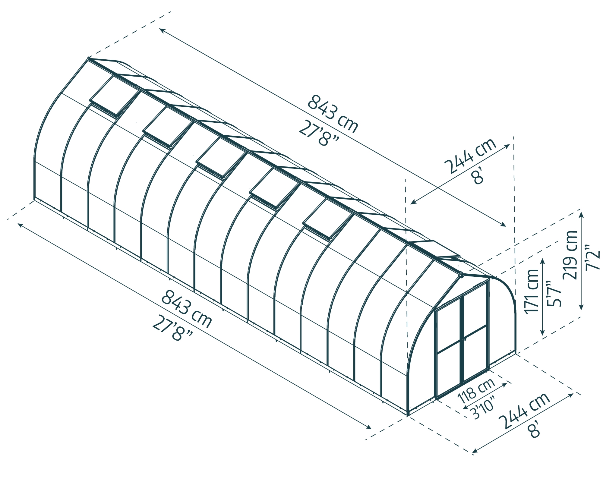 Bella este o seră frumoasă și practică, cu lățimea de 2,4 m, care are panouri din policarbonat cu pereți dubli, practic indestructibile, creând o combinație ideală de difuzie a luminii solare, izolație termică și siguranță pentru toate nevoile tale de grădinărit.  Această seră rotunjită a fost special concepută pentru a îmbunătăți rezistența la vânt și a permite zăpezii să alunece ușor.