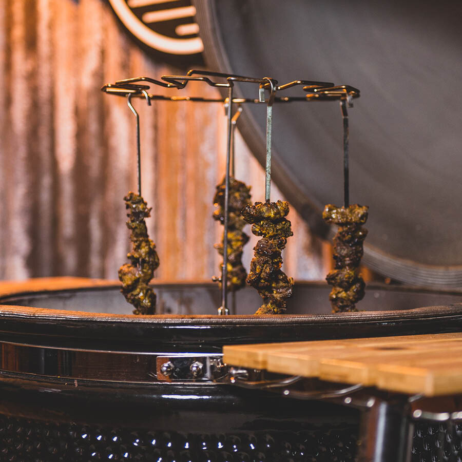Setul YAKINIKU Tandoori BBQ este un instrument indispensabil pentru pasionații de grătar care își doresc rezultate profesionale. Proiectat special pentru grătarele Kamado, acest set permite gătirea uniformă a ingredientelor prin suspendarea lor în centrul suportului, unde sunt expuse constant la căldură.